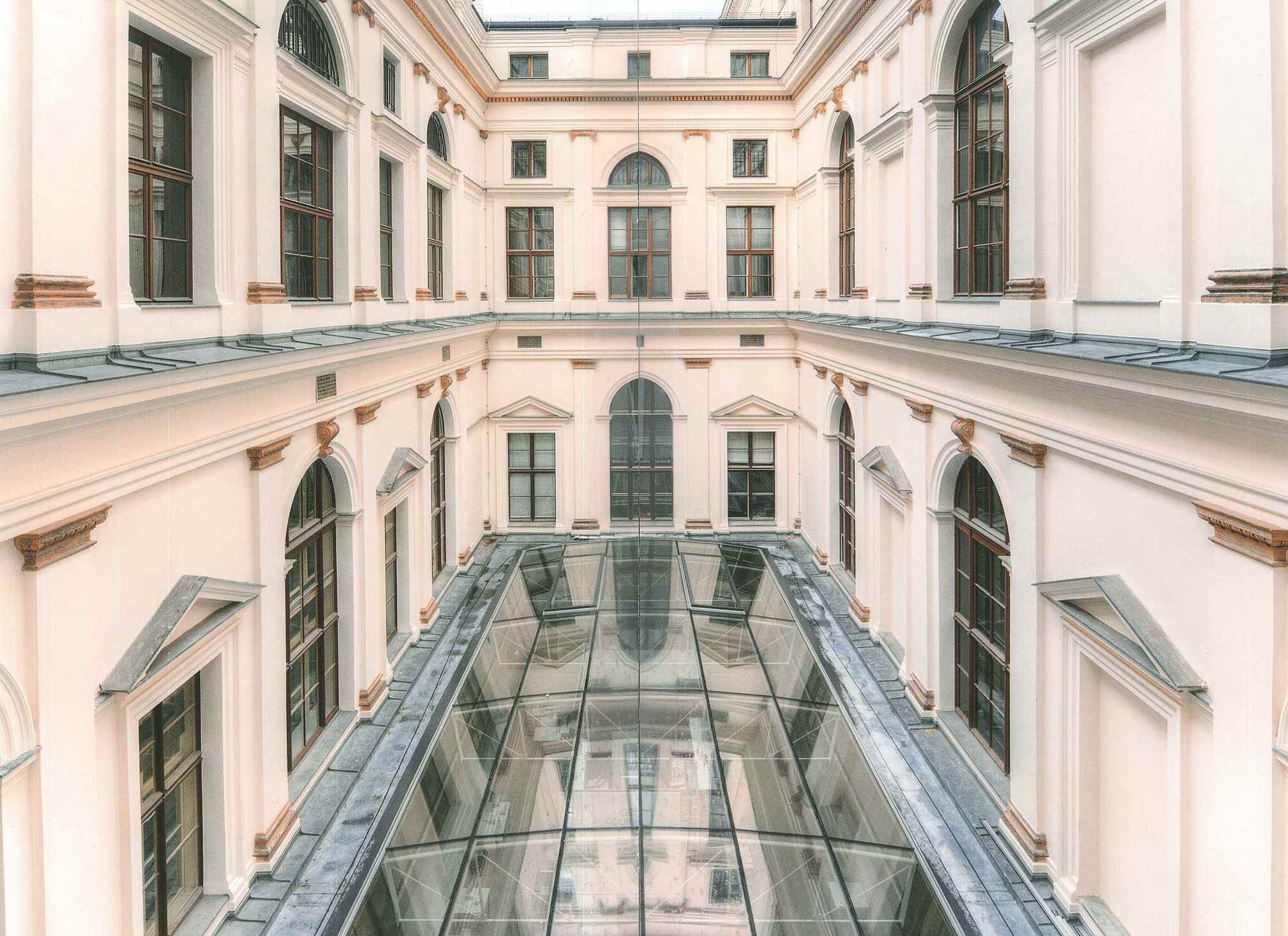 Tätigkeit: Statische Berechnung der Glas- Stahlkonstruktion für die Glasüberdachung von Hof 8 der Universität Wien. Auftraggeber / Bauherr: DI Gunther Palme ZT-GmbH