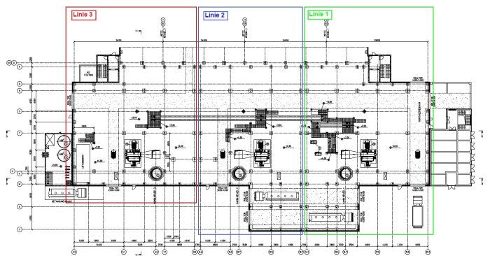 Anlagengröße: ca.100m lang, 50m breit und 42m hoch, unterteilt in drei Bereiche mit jeweils ca. 1.000t Apparatelasten